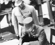 9点钟整,仪式开始。麦克阿瑟首先代表受降的盟国讲话。接着,父亲隐约看见一个穿大礼服的日本人走到桌前签字(日本外相重光葵)。他腿有残疾,拄着一支拐杖。然后是一个军人(日本陆军参谋长梅津美治郎)签字。