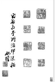 朱屺老接着从他的几方“梅花草堂”堂号印章中又挑出自己最喜欢的一方,凑成“八”方这样一个吉利数字,随后,他又用毛笔题了“白石为予所治印选拓”九个字,落“屺瞻”款,款下钤“朱屺瞻”名章、“起哉”字印,全纸共收十方齐白石篆刻的印章。
