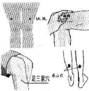 腿部刮痧 在腿上抹好乳液,用刮痧板按照伏兔穴、血海穴、足三里穴、承山穴的顺序从上向下刮,每个穴位刮20下,要快速、用力,左右腿轮换。