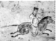 甘肃省博物馆馆藏“邮驿图”出自其中的第5号墓。我国疆域辽阔,由国家统一组织、掌管的信息传递网络和制度,至少在商代即已初步形成,至西周有了进一步的发展。政府在交通干线上每隔三十里设一驿站,车马常备,以接待往来的政府官员、负责传达政令文书的使者和运送货物的吏役,休息并更换车马。秦始皇统一天下后,书同文,车同轨,并在全国许多重要地区修筑驰道,更加强化、完善了驿传制度。“邮驿图”描绘的就是驿传通行的一个场景:奔马迅疾的身姿,显示出驿递任务的重大和紧迫;骑使所举传符,乃通过关门哨卡的凭证,飞驰中仍需手持擎示,是为了不至于因关卡验符而减速。头戴黑帽,身着短衫的驿使,手举邮件,且面部没有画出嘴,寓意守口如瓶,彰显驿传保密的重要性。这是迄今所知反映中华邮驿时代最早的绘画作品。它的出土表明了即使在混乱割据的魏晋时期,中央政府仍未放松对边远地区的控制和管理。它为研究我国魏晋服饰、绘画,尤其是邮驿制度提供了生动形象的资料。
