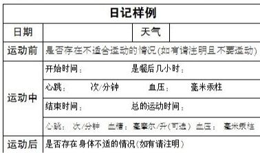 运动日记该怎样记录呢?糖友可以参考下面的日记样例记录。需要注意的是,糖友要了解以下不适合运动的情况:血糖控制非常不好(空腹血糖>14毫摩尔/升)或血糖控制不稳定时;高血压,收缩压在180毫米汞柱以上时;心律不齐,心绞痛等心脏病时;经常有脑供血不足,如时而有昏迷、头痛时;发生严重的视网膜病变时;糖尿病足时;因为肾功能障碍,出现蛋白尿、浮肿时;合并各种急性感染,如感冒发热时;腿痛、膝关节、踝关节功能障碍时;新近发生血栓时。