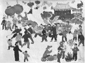 “我有一次很偶然地看到铁锈红的印度绸布头,这很像中国古城墙的色彩,就赶紧收起来。这种浑然天成的颜色是很难得到的。”这块布料也刚好用到《厂甸庙会》里的红墙。完成一幅布贴画并非想象中的剪剪贴贴,其实比画画难多了。画画可以使用颜料调和出自己需要的颜色。但布贴画的每个细节,是需要各种花色图案的布头拼接,往往需要等待很久才能遇到合适的布料。只有凑齐切合主题的色彩、质感和花纹,才能达到满意的效果。《厂甸庙会》里的人物衣着鲜艳,表情欢乐,展现出众多人物的不同姿态,像舞龙、敲锣、放鞭炮、放风筝、奔跑,既有庙会人流的摩肩接踵,又讲究绘画艺术的留白效果,一块块看似普通的碎布头,形象地表现出北京春节庙会的众生态。