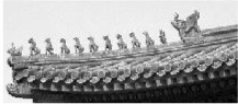 古代建筑檐角上的脊兽也叫镇瓦兽,由瓦制成,分为琉璃瓦和黑活瓦(砖雕瓦)两种。古代律法森严,琉璃瓦多数为皇家使用,老百姓家只能用黑活瓦。脊兽从唐宋时的一只,逐渐增加到数目不等的蹲兽,到了清代形成了今天常见的“骑凤仙人”领队的小动物队列形态。