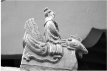 除了这些神奇的本领,脊兽自然少不了能带来吉祥好运。在檐角最前面的一尊被称为“骑凤仙人”,也叫“仙人骑鸡”,它的作用是固定垂脊下端第一块瓦件。据传,这位仙人的原型是齐国齐闵王,不仅《史记》中对这个典故有记载,民间也有“日晒闵王,走投无路”的说法。相传战国时期齐闵王被燕将打败,仓皇中被逼到了一条大河岸边,眼看走投无路准备自刎之时,一只凤凰飞到眼前,齐闵王危急时刻骑上它逃离了追杀。古人请他镇守脊端,借“乘鸡(吉)飞翔(祥)”的寓意,讨吉祥之意。