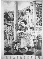 “月份牌里的女性常常是微侧着头,目光是从眼角上流出的,脸上是稍纵即逝的微笑,头上或衣上戴着鲜艳的花,要么身后,或身旁总有着插着花的花瓶,当然,在反映美好家庭生活的,还会有狗和小孩。”(《试论三十年代的上海月份牌》)