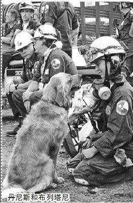 “9·11”搜救中,一天,布列塔尼突然离开了主人,任凭主人怎么呼唤也不服从。因为她看到一个消防员坐在地上满眼悲伤,布列塔尼走过去,卧在这个消防员旁边,把头躺在消防员的腿上……