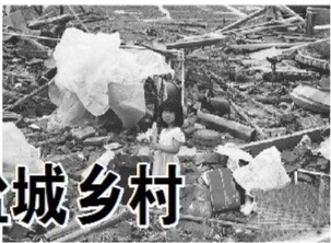 钢筋水泥的电线杆被吹倒,等距离地倒在马路上,构成混乱村庄唯一的整齐感;农用车被掀翻,翻了好几个跟头,吹到了河对岸,雨刮器吃力地划动着,把灾难的画幅一会儿揭开,一会儿遮上;只一瞬间,立新村就成了没有屋顶的村庄,躲在屋里的人一抬头就望见了天,“不得了了”。
