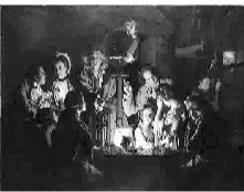画面上,一个科学家正在演示气泵的原理,随着空气被抽走,一只鹦鹉在垂死挣扎。在科学家周围围满了观察实验的人。有的全神贯注在观看,有的小声在交谈。