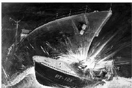 8月2日凌晨2时30分,PT-109艇右舷300码(约270米)外隐约出现一团黑影,肯尼迪和水兵们起初以为是另一艘鱼雷艇正向自己靠拢,但很快他们就意识到了错误:黑影远比鱼雷艇大,肯定是日本人的驱逐舰!肯尼迪急忙命令鱼雷艇向右转向,准备将鱼雷发射管对准目标,但已经来不及了。