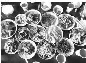 有的地方,讲究“三丸”、“三蒸”。也有的地儿就爱粗犷,四大盘、八大碗,蒸全鱼、蒸全鸭、蒸全鸡地招呼。还有的地域,“十大碗”,酱煮炖蒸样样齐全,就为着讨一个“十全十福”之彩。杂烩菜也不简单,那是最经典的“全家福”:大虾、海参、香菇、炖肉块再加上几片青菜特别提气。
