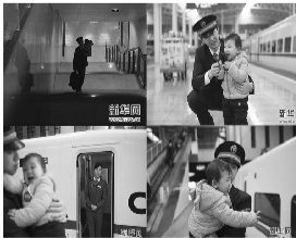 32岁的魏星和28岁妻子李欣是南昌铁路局客运段的列车长和乘务员。春运开始后,二人分别忙碌在两条不同的线路上,刚刚一岁十个月的儿子只得寄放在父母家。1月25日,魏星工作结束后,刚好碰上妻子的列车经停南昌十分钟,老人专门将孩子带上站台,一家三口在站台上有了难得的10分钟团聚。