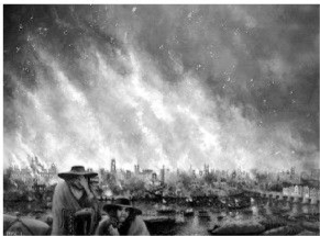 1666年9月1日,周六夜,泰晤士河北岸布丁巷(伦敦最窄的巷子之一)国王面包坊费林纳师傅,急着要为海军烘焙饼干。忙了一天,夜深人困,上床前他匆匆把煤炭扫进烤箱,放几条腌肉熏熏。凌晨时分,面包房一颗火星逸出烟雾。