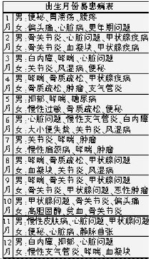 你出生的月份可能一定程度上决定了将来会得什么病,这结论并不像星座论一样玄乎。据英国《每日电讯报》报道,来自西班牙阿利坎特大学的科学家们认为,季节变换引起的紫外线强度、维生素D含量变化以及冬季易流行的病毒成分,这些都会影响子宫内胎儿的发育,从而影响以后患某种慢性病的几率(见表)。