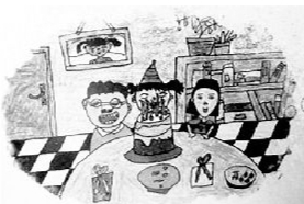 专家分析,在儿童的绘画中牙齿是情绪指标。画中的爸爸牙齿明显,孩子把自己藏在蛋糕后面,妈妈被画得特别小。可看出虽然是过生日,但孩子并不快乐。