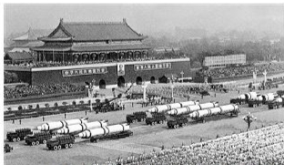1959年10月1日,天安门广场上举行了盛大的阅兵式。新拓宽的长安街上展示的新装备九成以上都是由国内军工厂生产出来的,受阅的步兵全部手持56式冲锋枪或半自动步枪,炮兵装备的是59式高炮和加榴炮,装甲兵装备的是刚刚出厂的59式坦克。