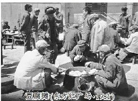 广场边上还有个啤酒馆,其实很少卖啤酒,在那个年月里,喝啤酒可是件十分奢侈的事。平常吃饭最多的是些附近赶集的农民,咬咬牙买上一碗两角钱的大锅菜,再喝上一角钱的老白干。把嘴一抿,那种满足感就别提了。更多是那些省钱的,索性就买二分钱一碗的白开水,就着咸菜啃窝头。偶尔有些机关和厂矿的人凑在一起,狠狠心花上四、五元钱,炒上几个菜撮一顿。赶集的乡下人并不知道冒着泡沫的玩意是什么味道,只是愤愤地想:这些像驴尿一样的玩意也能喝?