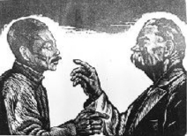鲁迅逝世后的第二年,即1937年春夏之间,青年版画家陈烟桥接连创作了塑造鲁迅形象的木刻版画《光明的指导》《鲁迅与青年运动》《鲁迅提倡木刻》和《鲁迅与高尔基》四幅作品。其中《鲁迅与高尔基》的情节虽是虚构的,却是合乎情理的虚构。这幅作品用粗放简约却深含情感的刀法,表现鲁迅和高尔基这两位文化巨人倾心交谈的情景。中俄两位文化巨人都逝于1936年,未曾谋面。尽管如此,二位思想上息息相通,精神上早就彼此神游互访了。这幅作品的独特构思和艺术表现,令人佩服。