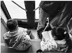 在河南郑州一辆较为拥挤的公交车上,两个七八岁左右的孩子坐在车门旁的台阶上,一人手捧一本儿童读物,不顾车厢内的拥挤、嘈杂,埋头仔细阅读。