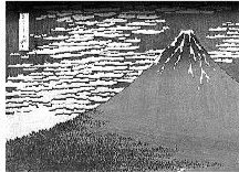 葛饰北斋在古稀之年迎来了他艺术生涯的巅峰。他花5年时间,从不同的角度、季节、方位来描绘富士山景色,创作出一生中最精彩的《富岳三十六景》,开创了浮世绘风景画的新形式。这其中,创作于1831年的《神奈川冲浪里》,可谓世界上最为著名的浮世绘。翻滚的浪花与山峰形成巧妙的呼应,巨浪之下的富士山虽处画面的下方,但依然显示出一种雄壮。画中隐含着关于天地人的理念与意境。此画的名字常常被误读,正确的读法应为“神奈川冲·浪里”,“神奈川冲”是地名,“浪里”意指在大浪的后面。同年创作的另一幅富士山《凯风快晴》里,富士山通体红色,夸张而有力,此画也被称作“红富士”。这两件作品不仅是浮世绘的经典之作,也已成为日本美术的标志性符号。