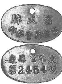 当时广州市警察局颁发的狗牌究竟是什么样子,笔者暂时尚未见到。倒是见过1938年伪满洲国统治下的东北地区的一枚狗牌,椭圆形,金属铸造,正面铸印“畜犬牌”三个大字,背面铸印狗牌的编号和颁发时间。