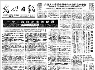1986年6月17日,《一个工程师出走的反思》一文在《光明日报》一版头条位置加编者按隆重推出,这是《光明日报》20世纪80年代影响最大的报道之一。