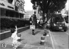 ④今年“五一”期间,担任巡逻任务的上海武警周帆和战友步巡时,恰巧遇上正在逛街的爱人和儿子,刚满两岁的孩子见着爸爸后,急忙跑到跟前“求抱抱”,但全副武装的周帆只能哄开孩子,“因为我还有执勤任务”。