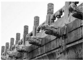 以故宫前三殿太和殿、中和殿和保和殿为例,前三殿建在8.13米高的三层台基上,台基四周栏杆的底部有排放雨水的孔洞;每根望柱下还有一个雕琢精美的石龙头,名曰“螭首”,其口内为凿通的圆孔,也是辅助排水的孔道。每逢雨天,雨水从1142个排水孔喷出,呈现“千龙喷水”景观,逐层下落,流到院内,使得台面无积水。