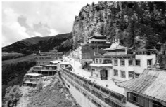 尕尔寺建在一道极其险峻的悬崖上。我们正在峡谷间穿行,忽然就瞥见了那如在云端的庙宇金顶。仰望尕尔寺,像极了北岳恒山的悬空寺。只不过悬得更高离天更近,其下断崖足有千尺。遗憾的是此时天空阴云翻涌,细雨甫落,金顶红墙只隐隐可见,蓝天白云下危岩古刹的雄浑气象只能留待想象了。
