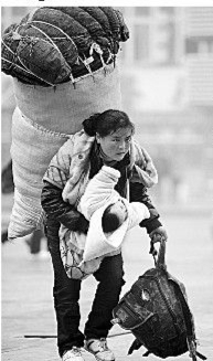 “女本柔弱,为母则刚”在这幅照片中得到了最好的诠释。年轻妈妈怀抱婴儿负重前行的形象,感动了无数国人,成为春运历史上最动人的瞬间之一。