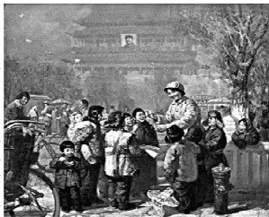油画《没有共产党就没有新中国》就是这样一幅具有人性温度、情感真切的作品。它从一个很小的视角,反映出伟大变革时期一个真实、生动、感人的场景:1949年1月31日北平和平解放不久的早春季节,在古老北京的市中心——正阳门小广场,一位“军管会”女兵在教小朋友们学唱“解放区的流行歌曲”。这些场景及情节源于油画创作者张京生的亲身经历,故而画面的温度带着作者的情感温度,带着作者心律的脉搏跳动,因而具有更强的可信度及亲切感。