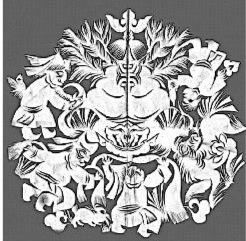 此外,在段建珺作品中反复出现北方草原祥瑞动物纹样,如马、羊、牛、犬、狼、鹿、虎、狮、龙、蛇、鹰、猴、凤凰;还有动物与植物、人、祥瑞符号等纹样结合的复合式纹样组合,如对马捧(祝)寿、对羊捧寿、对犬生命树、鹿踩金莲、葫芦生子、狮子护塔、蛇盘兔儿、鹰踩兔儿等,这些都反映了我国古代北方少数民族动物崇拜和祖先崇拜。透过段建珺的传统剪纸,我们会发现,那些隐藏在剪纸深层的闪耀着光芒的远古文化气息,才是段建珺剪纸传承的血脉和灵魂所在。