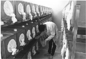 待蚊子交配后,研究人员会给蚊子喂食羊血,1万多只雌蚊一顿可以消灭十几毫升的血。吃饱血后,雌蚊会产卵,一次产下上百枚。这些卵会粘在笼子底摆放着的湿润纸条上。每隔几天工作人员来收取,一张纸条上的卵可多达数十万枚。