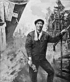 宋惠民笔下的孟泰右手拎着一个大扳钳子,左手扶着楼梯栏杆,已在高处的孟泰正往更高处去。这是宋惠民的匠心,这个楼梯的“弹性”最大,这是孟泰精神世界的楼梯,亦是孟泰在引领后来者提升职业的精神高度。经过了50年的沉淀,孟泰的形象终于像一只成熟的果实那样,完美地闪亮在宋惠民艺术大树的枝头。