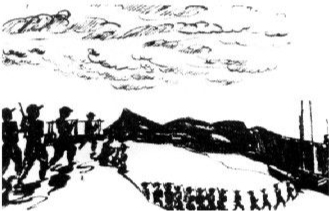 第二天六时早起,七时继续向草地纵深进发了。今天过分水岭,这分水岭是草地水向前向后,顺流与倒流之分。部队在过分水岭之时我与一营营长同志拿出望远镜向前面大草原一望,“嗨哟,了不起,前面根本没有什么路,就从草上走过。”一营营长说。望望在我们前面走的部队,是一条长有几十里的弯弯曲曲的蛇行似在走动。从近处向远方看去,看见的人是从大到小,最前面部队只看到一条黑黑点点的在移动,就像一串长长的黄蚂蚁向前走一样。今天的草地比起昨天更难走了,沿途都是陷泥坑,不注意一脚踏进泥坑里去,咕的一响,稀泥水就会漂到你的鼻子尖。有的陷进去以后要同志们帮忙,很久才能拔出来。如果两腿都陷进去,那就难以想象了。如果两腿踩,越踩却越深,连你的头发也会陷进去。如果有同志遇到这不幸的事,只得用绳子把他拉起来,即可得救无忧。这是我们草地行军的经验。我们英勇的意志坚强的红军战士们,是在连续与这些无形的敌人斗争着前进,夜宿晓行,连续走了六天。这几天的宿营地全是草地,不过可以找到些地势较高的地方宿营。问题又来了,较高的地方都没有水吃,只有从低处去抬水回来吃,这算不了什么。