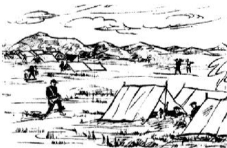 今天到下午时正下着毛毛雨,今晚我们就在树下搭起帐篷和架起睡铺,帐篷大部分是以单被,小部是以油布搭成的,看起来还不错,这就是森林里的营房。我们的炊事员同志到睡觉的时候,上面是搭起了帐篷,下面是扁担架起的床铺。这种床铺是两头放着钢锅,中间横架一条扁担。睡下去是两脚落地,面朝星星。如有人问:“炊事员同志,这能睡吗?”他就不犹豫地答复:“能,很好,还可免得风湿病。”引得大家轰然一笑。