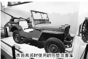 隔着不远,还有一辆吉普车展品。这是1949年,毛泽东在西苑阅兵时乘坐的同款车,生产商是美国福特公司。当年,北平市的一位副市长建议将自己乘坐的一辆高档轿车作为检阅车辆使用,几位民主人士也争相邀请毛泽东使用自己的车。毛泽东都没同意,他笑着说:“用我们缴获的战利品——美式汽车检阅部队,岂不是更有意义么?”
