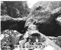 怪石嶙峋的河滩上,一块一块石头垒成一座“纪念塔”,塔边放置粉色手套、仅剩一块板的背包,蓝天救援的帽子置于垒石的最高层。溪谷往上不远,另一座石塔上,只有一条剪断的安全帽绳扣,顶层的安全帽上写着BSR(蓝天救援缩写)。