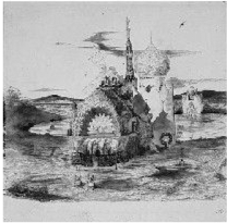 他几乎不画油画,早期也很少画水彩画,而是偏爱墨画。这种墨,不纯粹是作家案头必备的墨水。在给诗人波德莱尔的信中,雨果写道:“我只是在这些画里混合用上点铅笔、木炭、乌贼墨、煤粉、炭黑,以及各种各样稀奇古怪的混合物,才能大体上表现出我眼中尤其是我心中的景象。”所谓“稀奇古怪的混合物”,是雨果随时随地、信手拈来的各种材料,咖啡、茶水、草木汁液、火柴梗、烟灰,等等。