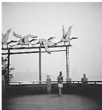 “经济大潮之下,这些东西是会慢慢被淡忘,被忽视的。我拍的其实是文化碎片,是一个大国背影。”严明说,他不断捕捉散落在各地的文化碎片,将之放在一起命名为“大国志”。2011年,“大国志”系列中的一幅照片《清晨的萨克斯》获第三届“侯登科纪实摄影奖”——这个奖专注于对中国当代社会生活的记录,是摄影界重要奖项之一。那张照片上,几只做飞翔状的假仙鹤被支在铁架上,一名男子站在下方吹萨克斯。