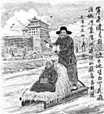 冰床也叫冰排子,它的构造简单,先用木板拼成一块长五尺宽三尺的床面,下面用木板做支架,在木板支架的下面钉上铁条,就像冰鞋下面的冰刀一样。在木床上面装上椅子,铺上毛毯或羊皮,舒适又保暖。大的冰床,可坐三四个人。租用冰床,讲好目的地和价钱,客人坐在软暖的椅子上,撑冰床的站在他身后板沿儿上,用三米多长的木棍子戳在冰面上,向后用力一顶,冰床就向前飞快滑动起来。这有点儿像水中撑篙行船一样。他拿的这根棍子还可以控制滑行的方向和速度。朔风呼呼吹着脸颊,护城河两岸的景色飞快向后掠过,十分惬意。当时有诗里说:“河头冻合坐冰床,偷得舟行陆地方。”可知冰床作为另一种交通方式,也是很受欢迎的。