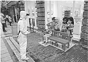 随着复工复产有序推进,3月30日,武汉市多家商场恢复营业。购物中心、商业街区员工已陆续到岗,全员佩戴口罩上岗。入口处均设立体温检测点,无疫情小区居民持健康码“绿码”扫码登记,测量体温正常、佩戴好口罩可进入。图为3月29日傍晚,在武汉市楚河汉街商业区,消毒员正在进行最后的街面消毒工作。