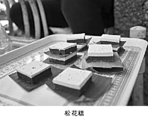 松树是裸子植物,松花其实就是松树花粉,颗粒非常细腻。松花粉是从松树花茸上收集得到的,十分珍贵。松花糕最上面是一层厚厚的黄色天然松花粉,上面混合着一些芝麻碎。最下面是一层制糕粉。中间夹着一层红褐色的豆沙和黄色松花粉。据说松花糕味道清甜,入口易化,令人唇齿留香。
