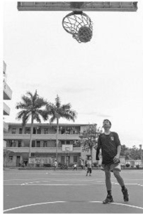 这是一场特别的篮球单挑。张家城左手掂着篮球,紧盯着高出一个头的防守球员,从三分线外一个单手背后运球,虚晃向左跨步,转身后仰跳投篮,他右臂半截空荡荡的黑色衣袖随身体扬起摆动,球中了。
