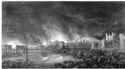1666年9月2日午夜刚过,伦敦老城布丁巷托马斯·法里内先生的面包店突然起火,一家人慌忙通过墙外的楼梯爬到邻居家里。女仆不敢爬楼梯,成为“伦敦大火”的第一个遇难者。