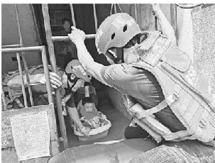 现场水位很高,差不多把整个一楼都给淹没了。被困人员无法走楼梯,只能从二楼的一个通风的水泥花窗中钻出来。怎么让他们安全下到船中呢?47岁的队员陆格永率先提出了解决方案:“我来做梯子,让他们一个一个踏着我的肩膀慢慢爬下来。”被困的男主人的体重有约180斤,方华很是担心地对陆格永说:“这比你还要重20斤呢。”但陆格永拍了拍自己的肩膀,眼里是满满的坚定:“来吧!”