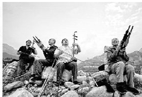 正如这首《问天问地问爹娘》歌曲中所唱,在层峦叠嶂的太行山上,有一支盲人队伍,他们背着行李,串成长串,抬头向天。队伍中的人一手抓着导盲棍,一手搭着前面人的背包或肩膀,脚尖颤巍巍试探之后,身体的重量才落下来。深一脚浅一脚,队伍蹒跚在山沟、小路上。行走,演唱,行走,演唱。一个村子,一个村子……寒来暑往,一年要走360多个村庄。