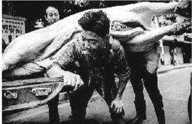 朱启伍走上前去,紧贴着车尾单膝撑地,几个人合力将去掉头尾的整猪拖到他的背篼上后,一使劲,他站起来,转身向农贸市场内走去。