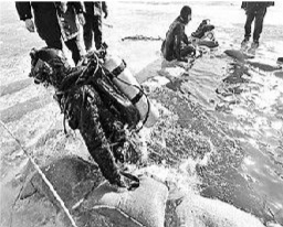 1月13日,潜水大队来到北京市平谷区,在一结了厚厚冰层的水库内冰潜训练。