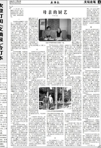 1960后父亲调到张家口解放军外语学院任教,那时候张家口是苦寒之地,加上遇到供应困难,一般家庭都觉得巧妇难为无米之炊,但母亲却非常乐观地随父亲在那里生活。寒暑假我会从北京去张家口看望他们,惊讶地发现,母亲仍有施展厨艺的机会。部队供应比地方强些,有时会分到带鱼,那些带鱼都十分瘦薄,头尾剁掉后所剩无几,左右邻居都把鱼头剁掉抛弃,母亲劝阻了他们,并以身作则,将那些鱼头鱼尾烹制成酥脆味浓的下饭美食,分给邻居们品尝后,各家主妇纷纷效法,都赞真妙!那时父亲有黄豆的特殊供应,母亲制成豆豉,喝杂粮菜粥时佐餐,味道极好,也曾赠送邻居一些,皆大欢喜。因为上世纪三十年代父母和三个哥哥都在宁波居住过,所以母亲会制作宁波汤圆,若有人能够给她提供麦苗,她还能制作青团,不消说都非常可口。