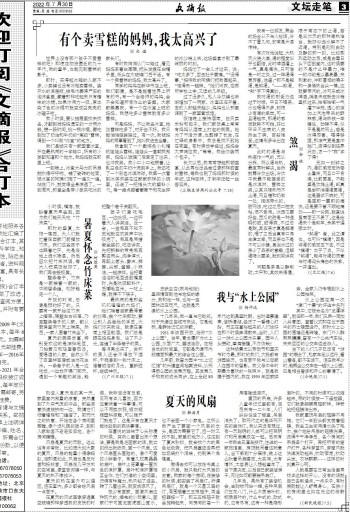 有时我悄悄从门口路过,看见妈妈系着白围裙,把头发盘在白帽子里,低头在大玻璃门后干活。有一个卖雪糕的妈妈,我太高兴了。